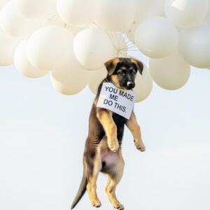 A German Shepherd puppy was hanging in the sky. You can’t even say he was tied to the balloons. Not really. It was…