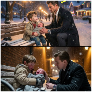 Snow drifted across the empty town square like tiny shards of glass, cold and glittering beneath the trembling glow of Christmas lights. The…