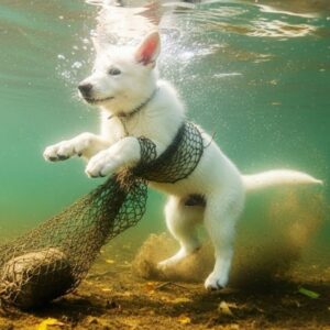 A white German Shepherd puppy, maybe just a teenager, was trapped in the nets and couldn’t get out of the water. It was…